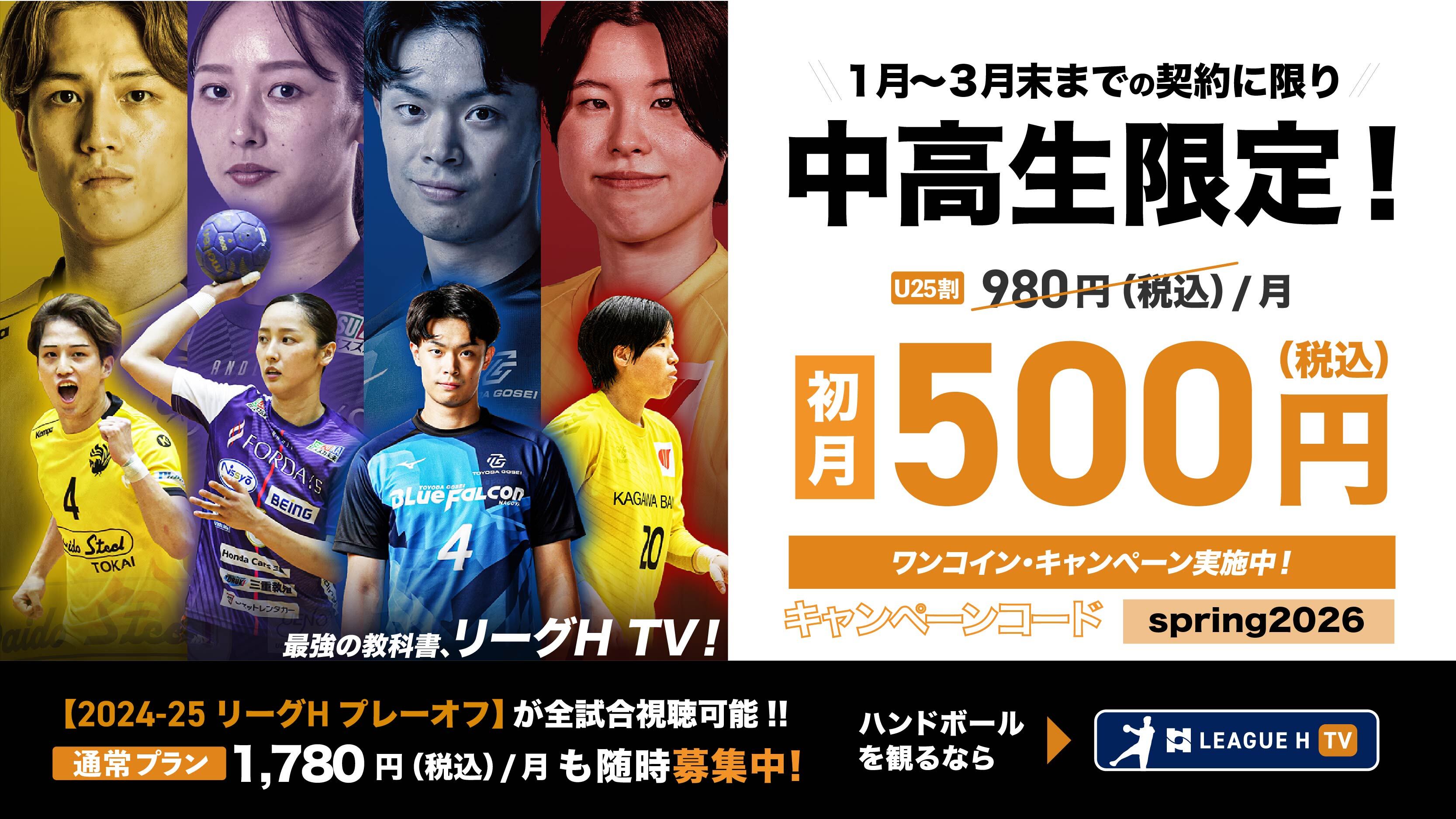 公式映像配信サービス「リーグH TV」において、中学生・高校生を対象とした「ワンコイン・キャンペーン」を実施いたします。