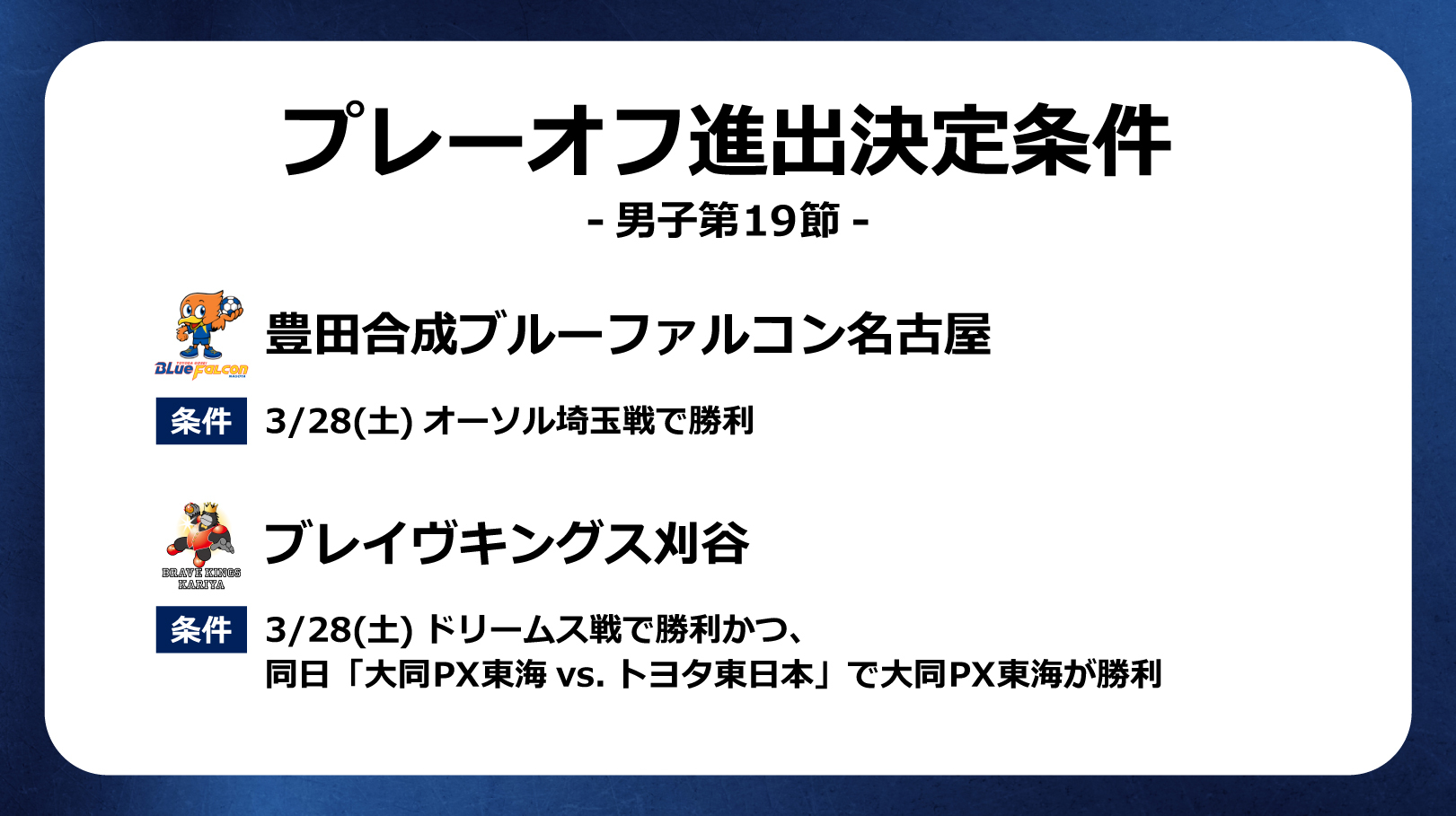 2025-26 リーグH レギュラーシーズンは3月28日に男子第19節の7試合が行われる。