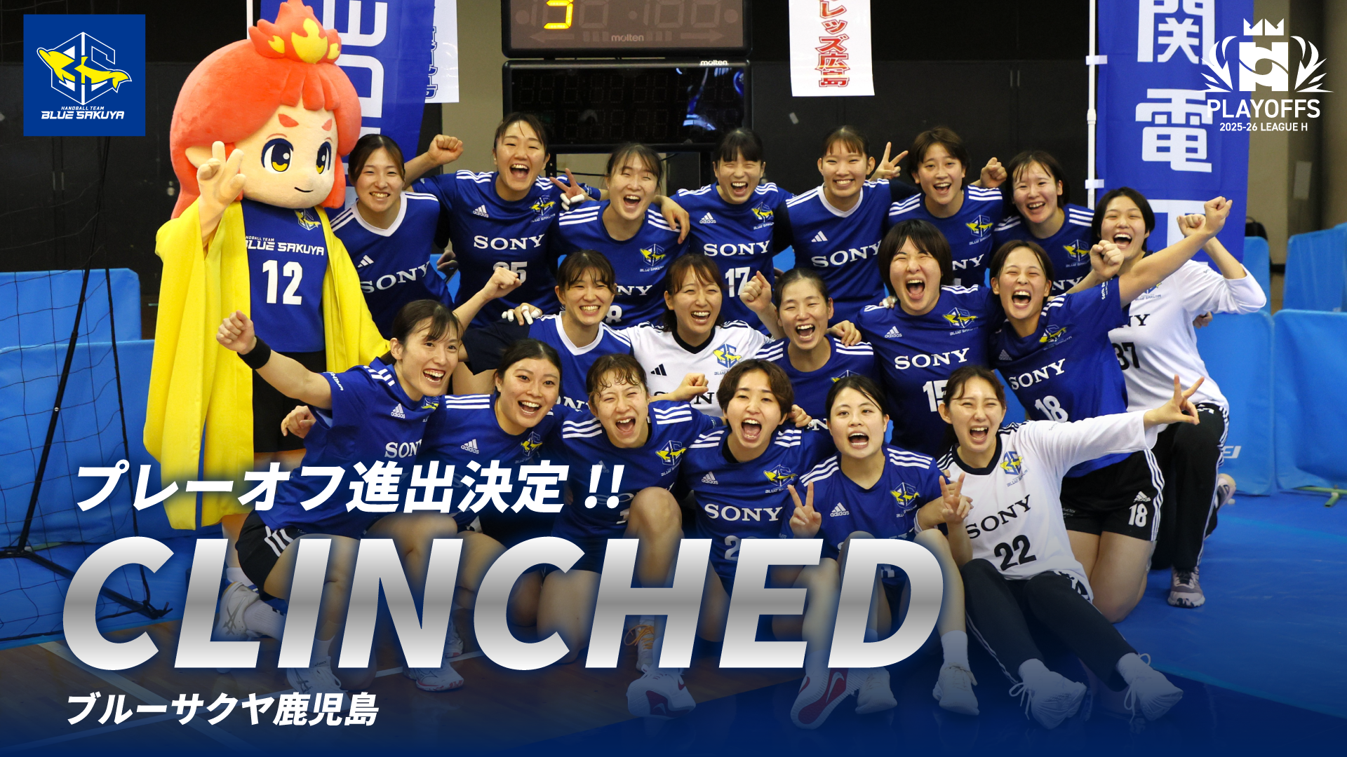 これにより、ブルーサクヤ鹿児島の2025-26 リーグH プレーオフ進出が決定いたしましたので、お知らせいたします。なお、ブルーサクヤ鹿児島は、6大会連続通算17回目のプレーオフ出場となります。